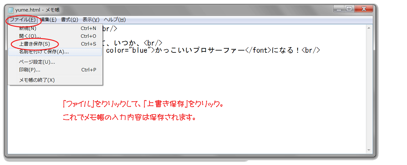 メモ帳は上図14のように、「メニューバー」の「ファイル」をクリックして、「上書き保存」をクリックするだけで、1時間目につけた「yume.html」のファイル名のままで保存ができちゃうよ。