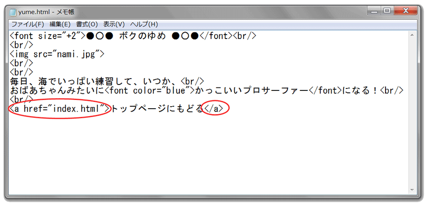 これがリンクを貼る為のタグだよ。新たに作るトップページの名前は「index.html」にするから、上記のようにメモ帳に入力します♪