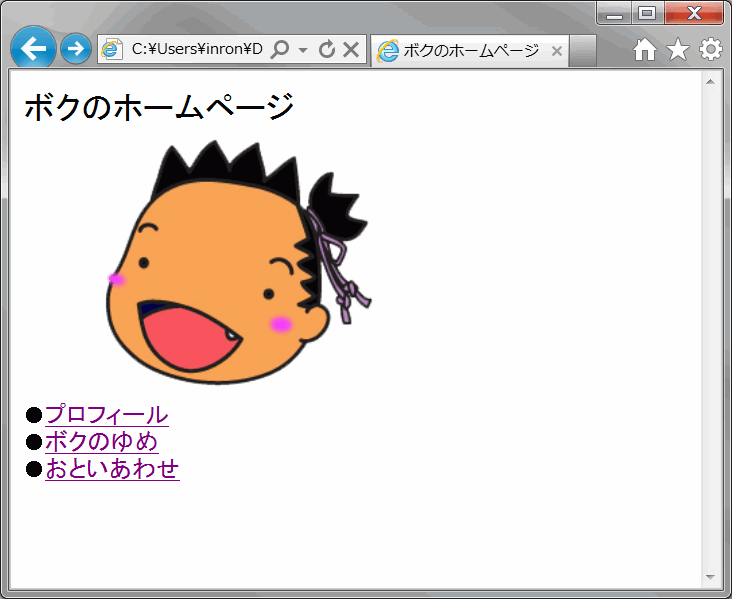 - まだ作ってない「プロフィール」と「おといあわせ」のリンクのところは、それぞれ「prof.html」と「info.html」のファイル名であとから作る予定だよ。