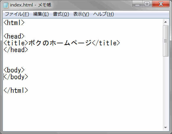 まずは前のページで覚えたばかりの4つのタグを早速入れてみよう(o^∇^o)ノ